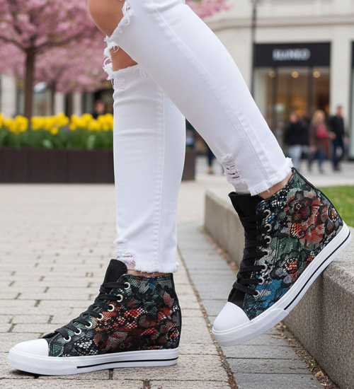 Wysokie sznurowane trampki na niskim koturnie Flower Black /F4-2 8087 S190/