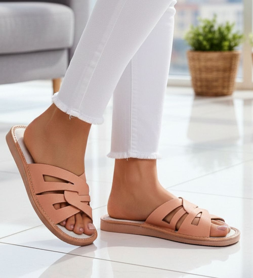 Beżowe klapki damskie z naturalnej skóry /E6-1 8453 S193/
