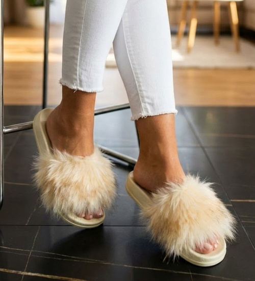 Beżowe klapki damskie z futerkiem /G4-2 4208 S1077/