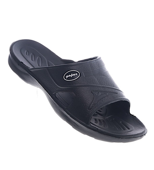 - Wodoodporne męskie klapki wykonane z gumowo piankowego materiału w kolorze czarntym.