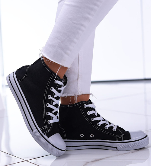 - Czarne trampki z wysoką cholewką- uniwersalne i praktyczne buty o sportowym charakterze.