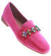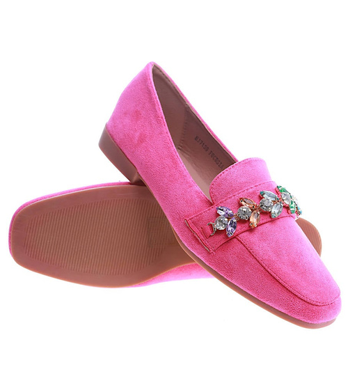 - Fuksjowe balerinki lordsy z błyszczącymi kamieniami, idealne dla kobiet, które chcą wyróżnić się w tłumie i dodać odrobiny blasku swoim codziennym stylizacjom.