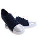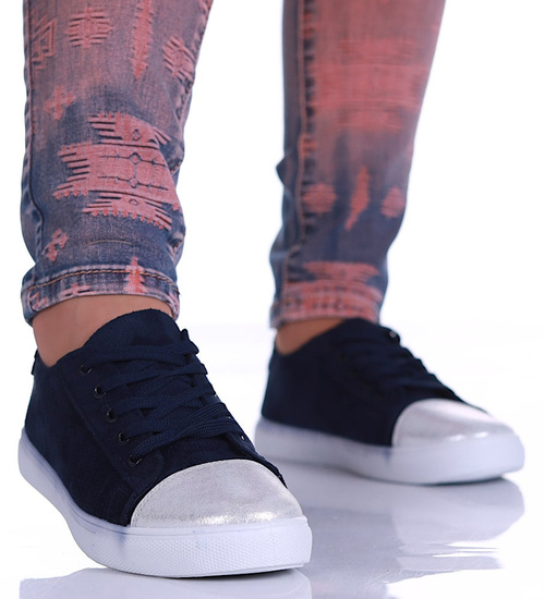 - Sznurowane damskie trampki wykonane z zamszowego materiału w granatowym kolorze.