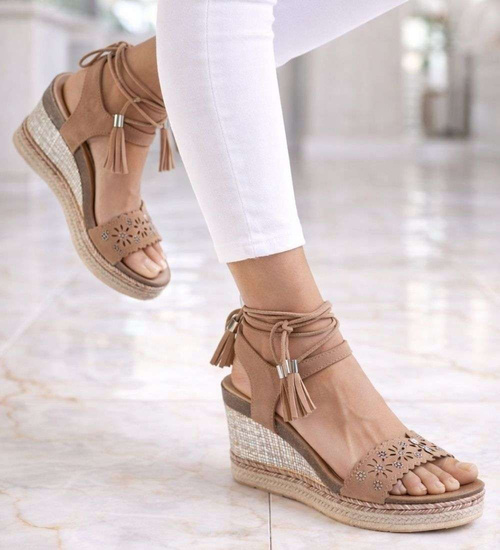 Sandały na koturnie i platformie karmelowe /D8-3 14057 S291/