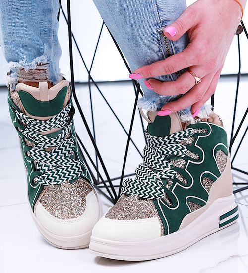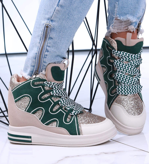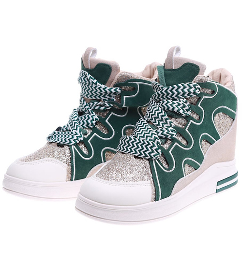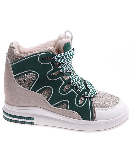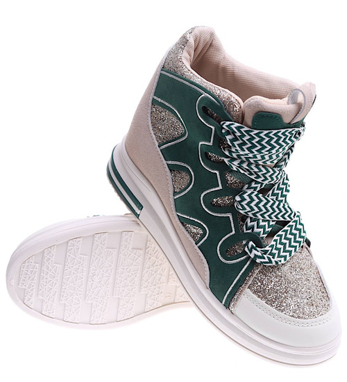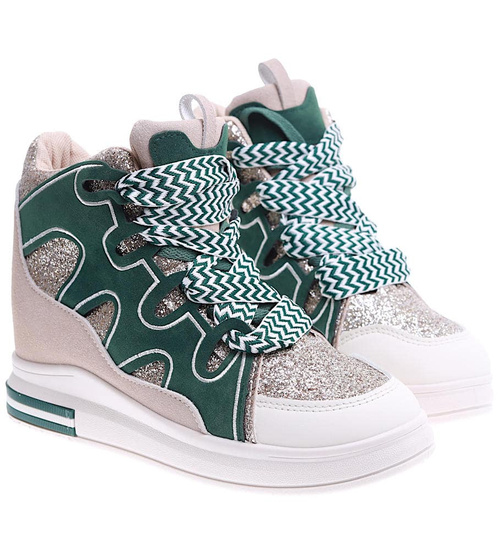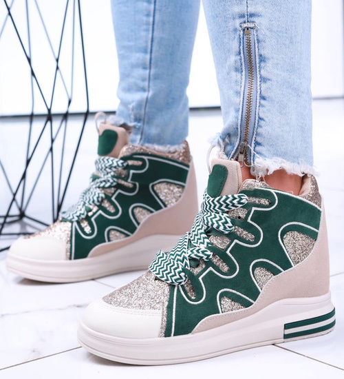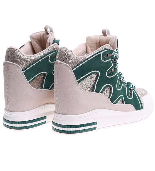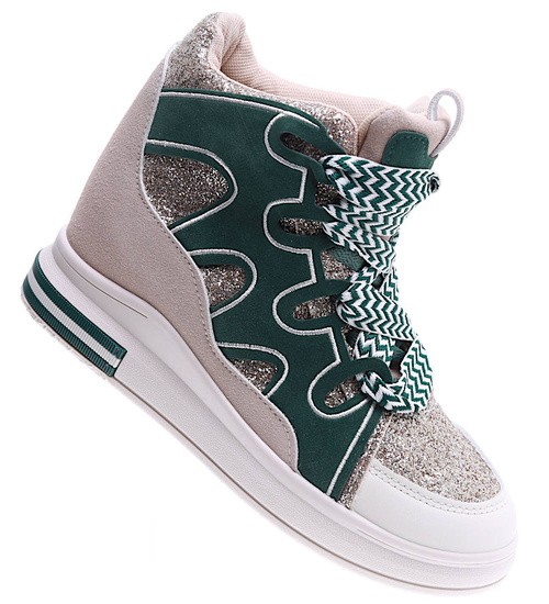 Wygodne wiązane damskie trampki na koturnie to idealna propozycja dla kobiet ceniących modny wygląd i wygodę. Buty zachwycają harmonijnym połączeniem zieleni i beżu, które przyciąga uwagę i doskonale komponuje się z codziennymi stylizacjami. Charakteru dodają im prążkowane biało-zielone sznurowadła, wprowadzające nowoczesny akcent. Dzięki niskiemu, ukrytemu koturnowi sneakersy delikatnie unoszą sylwetkę, zachowując przy tym sportowy charakter. Model ten świetnie sprawdzi się zarówno w miejskich, jak i casualowych zestawach, zapewniając komfort noszenia przez cały dzień. Jeśli szukasz obuwia, które połączy modę z wygodą, te sneakersy będą doskonałym wyborem.
