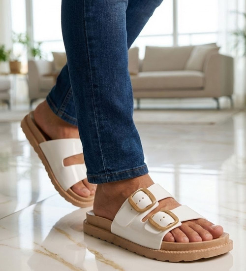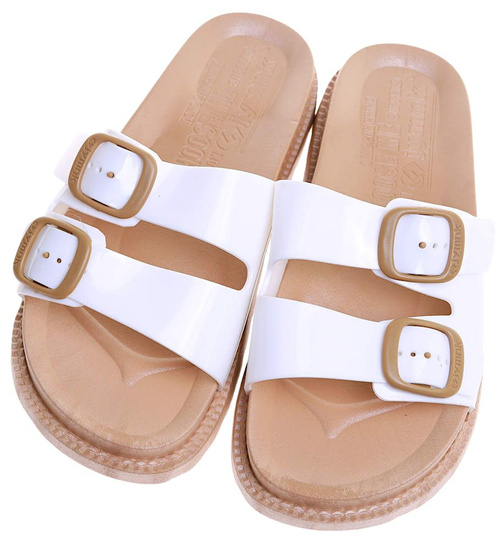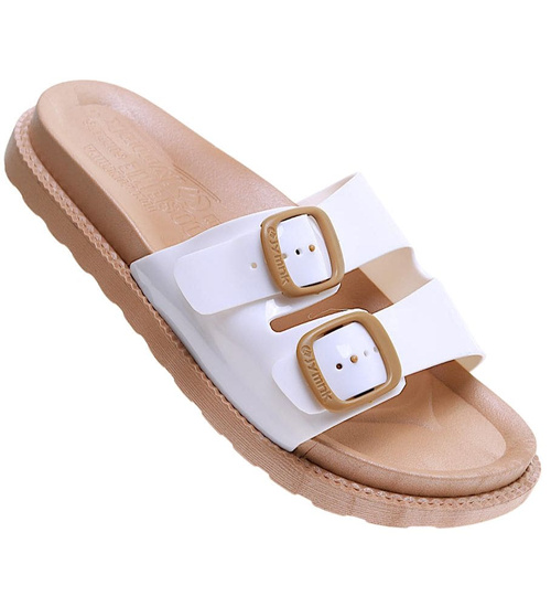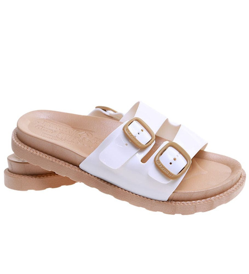- Wodoodporne męskie klapki wykonane z gumowego materiału w kolorze białym.
