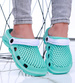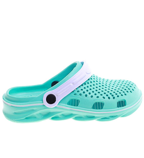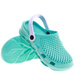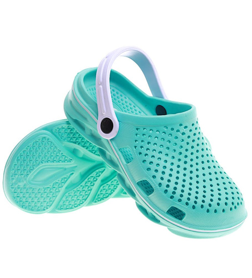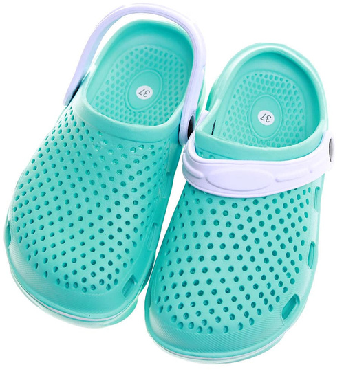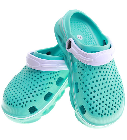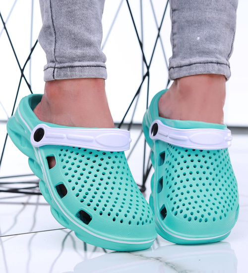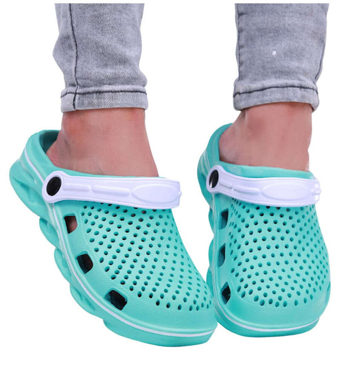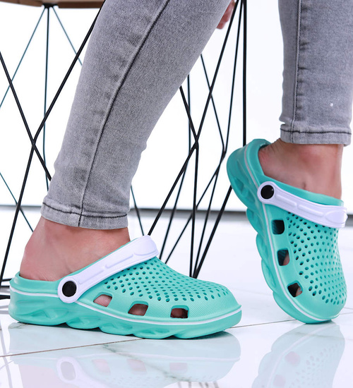 - Kryte klapki damskie wykonane z lekkiego, gumowo piankowego materiału w turkusowym kolorze.