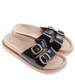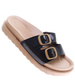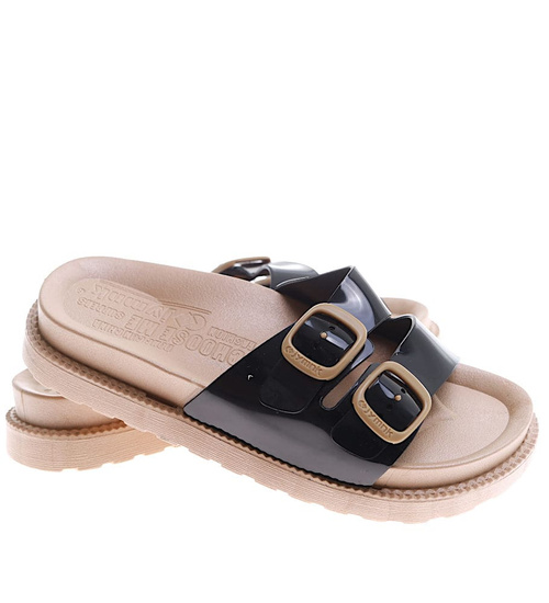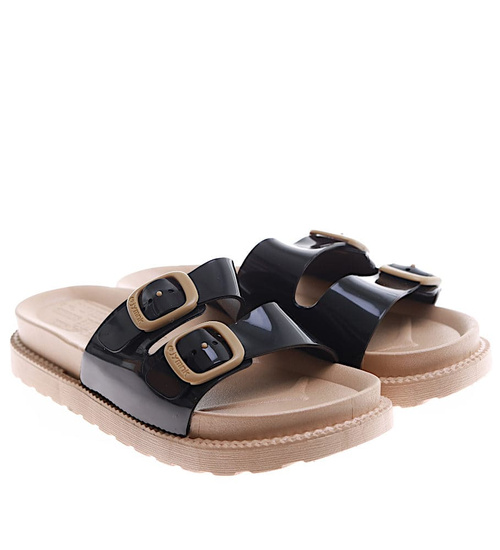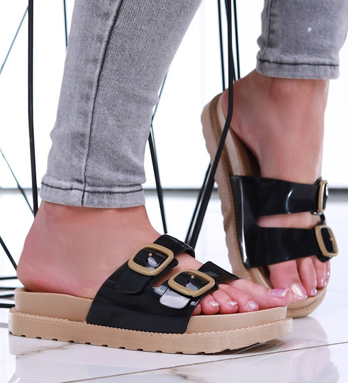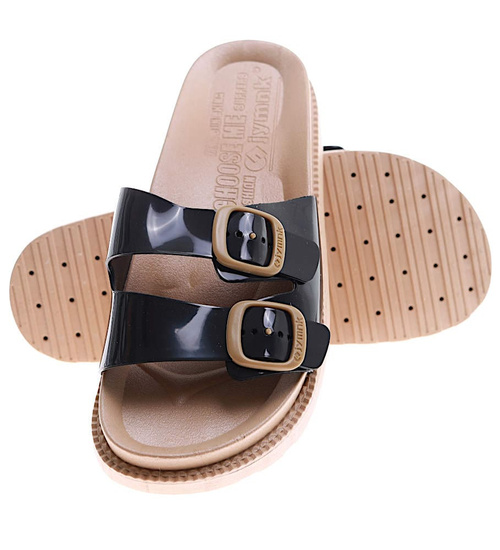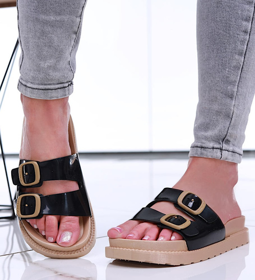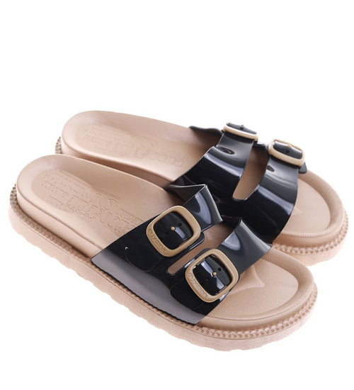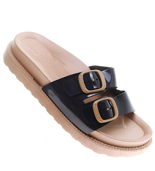 - Czarne damskie klapki wykonane z gumowego materiału.