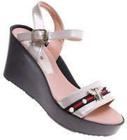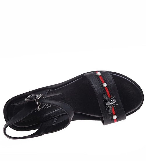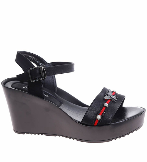 - Czarne damskie sandały osadzone na stabilnym koturnie oraz platformie.