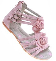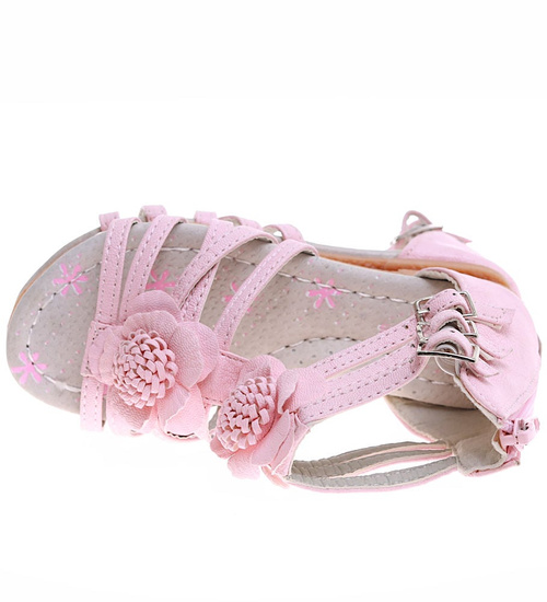 - Przewiewne dziewczęce sandały wykonane z miękkiego materiału skóropodobnego w różowym kolorze.