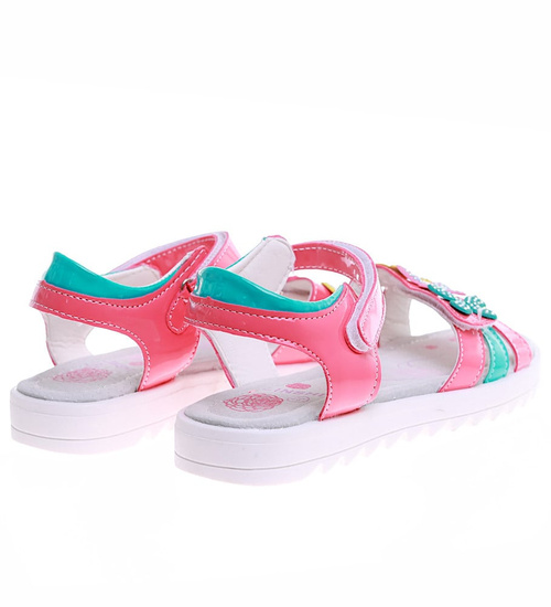 - Sandały ozdobiono kolorowymi kwiatami.