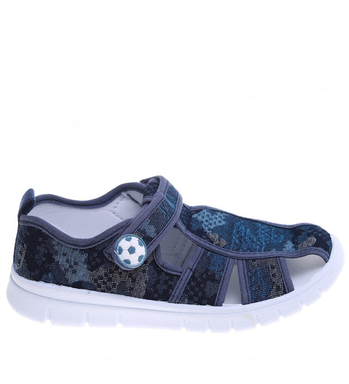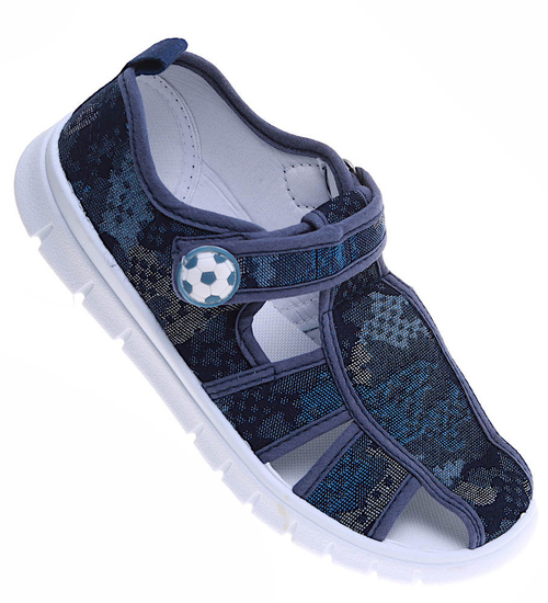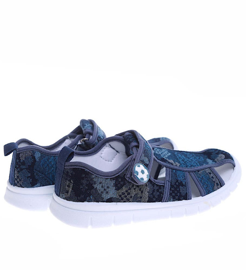 - Chłopięce sandały wykonane z miękkiego materiału tekstylnego w kolorze niebieskim.