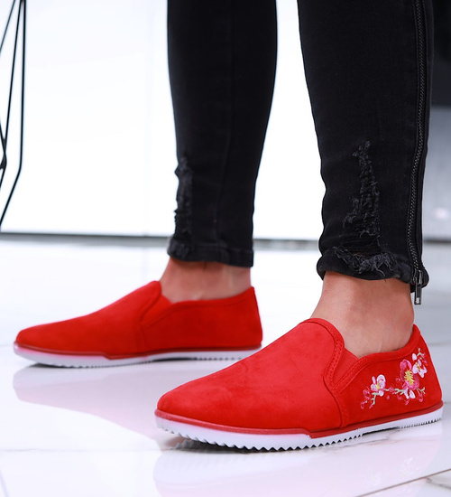 • Śliczne czerwone tenisówki z kolorowym haftem w formie kwiatów.