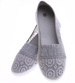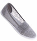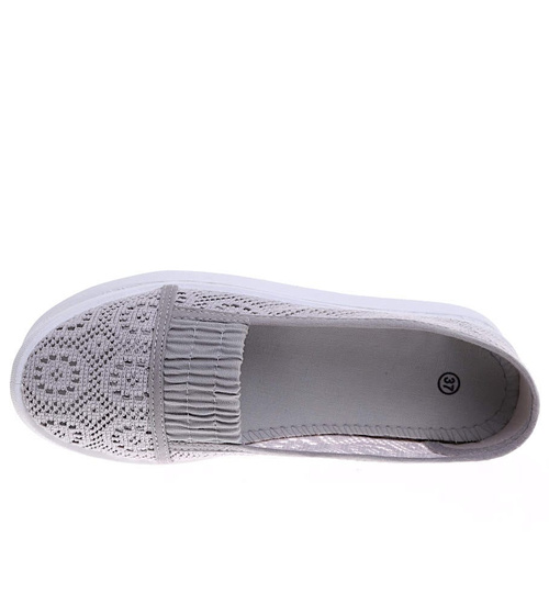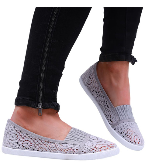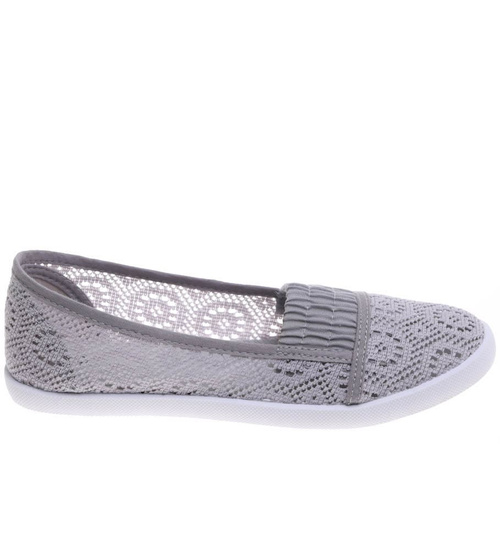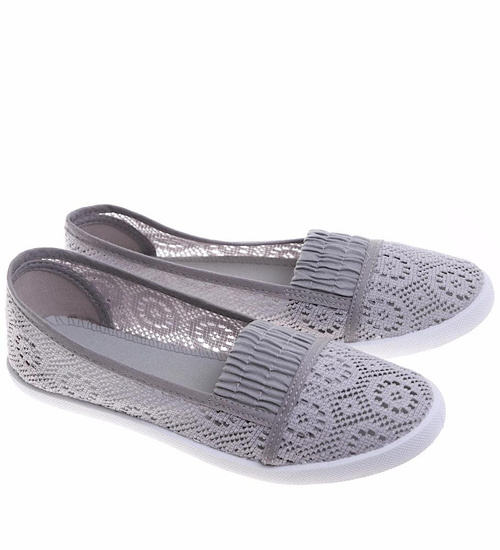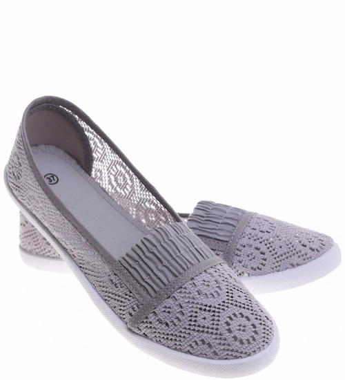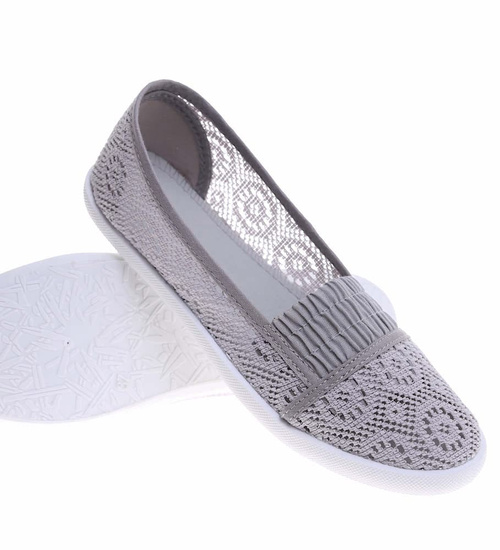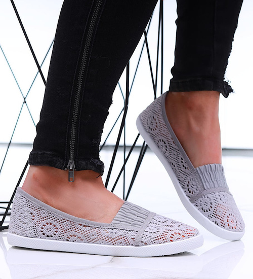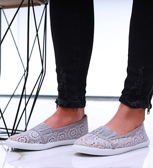 - Ażurowe damskie tenisówki wykonane z miękkiego, koronkowego materiału w szarym kolorze.