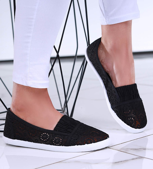 - Ażurowe czarne tenisówki wykonane z miękkiego, koronkowego materiału.