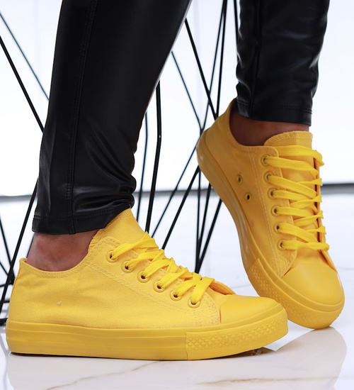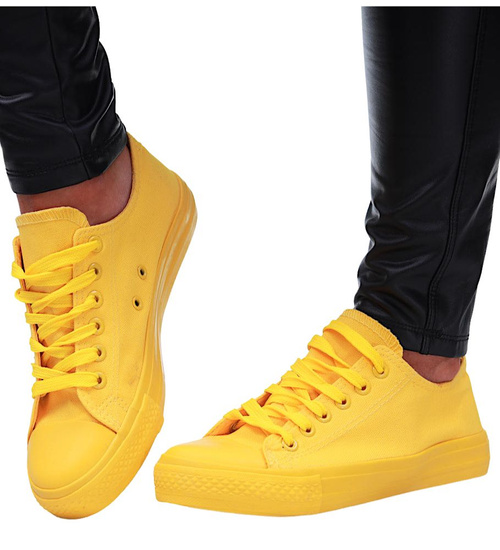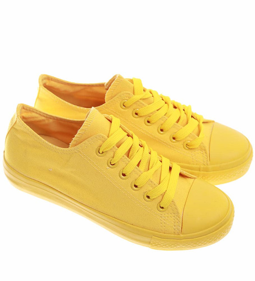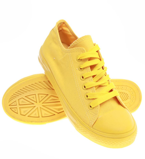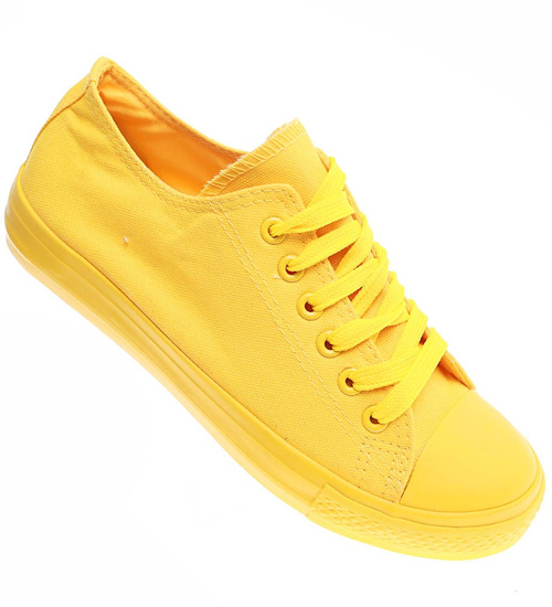 - Sznurowane materiałowe trampki w wakacyjnym, żółtym kolorze.