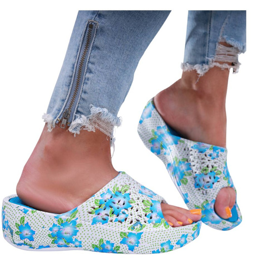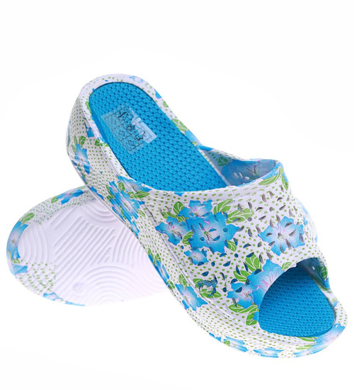- Niebieskie klapki damskie wykonane z miękkiego, piankowo gumowego materiału.