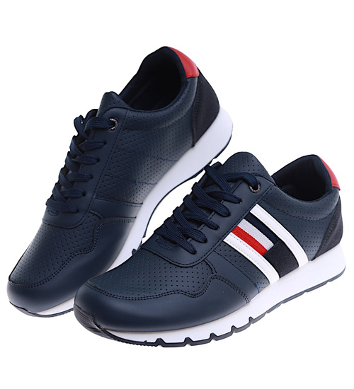 • Stylowe i funkcjonalne granatowe trampki męskie, które doskonale łączą sportowy design z elegancją.