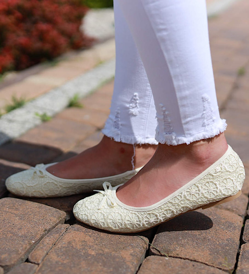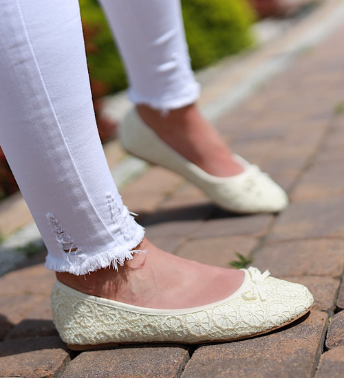- Beżowe baleriny z koronkowego materiału to elegancja i delikatność w jednym.