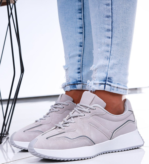 Szare buty sportowe, które stanowią niezbędny element garderoby każdej aktywnej kobiety. Wyposażone w klasyczne sznurowadła, te buty zapewniają stabilne dopasowanie i stylowy wygląd.