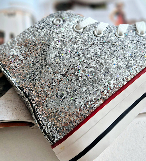 - Komfortowe srebrne damskie trampki wykonane z miękkiej tkaniny powleczonej błyszczącym materiałem.