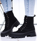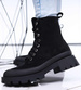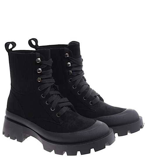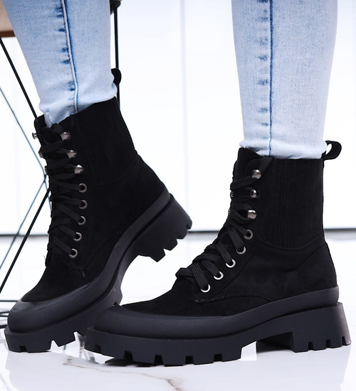 - Czarne damskie botki typu trapery wykonane z materiału zamszopodobnego to połączenie stylu i funkcjonalności.