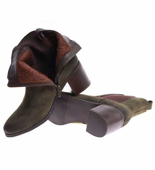 - Wnętrze zielonych botków zotało lekko ocieplone kocem obuwniczym, który zapewnia komfort noszenia przez cały dzień. Osadzone na stabilnym obcasie typu słupek o średniej wysokości , buty oferują pewność kroku i wygodę nawet podczas dłuższego chodzenia. Taki model jest świetnym wyborem na chłodniejsze dni, zapewniając odpowiednie wsparcie i wygodę.