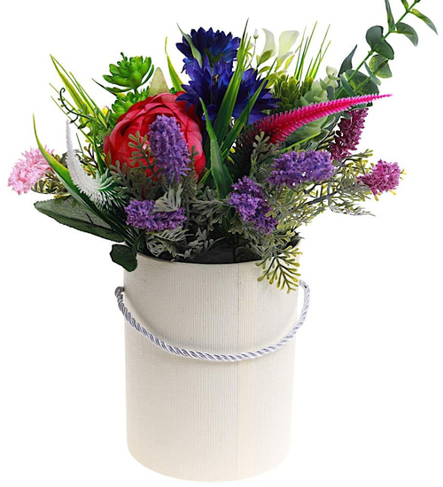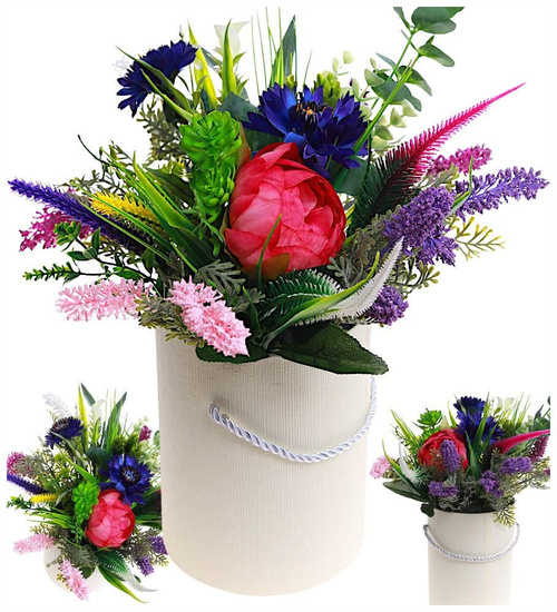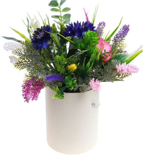 - Beżowe udełko podkreśla piękno kwiatów, tworząc wyrafinowany, a jednocześnie minimalistyczny akcent, który świetnie komponuje się z różnymi stylami aranżacji wnętrz.