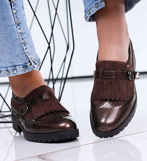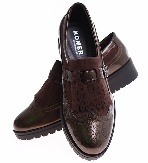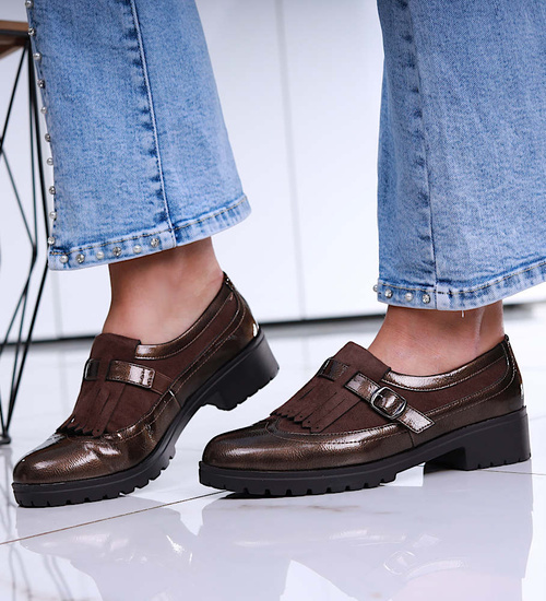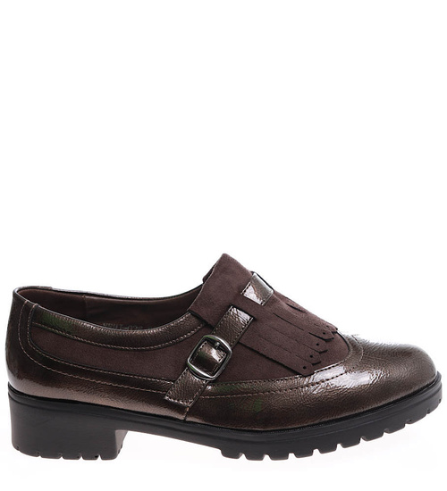 - Damskie półbuty wykonane z błyszczącego materiału skóropodobnego w kolorze khaki.