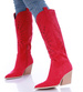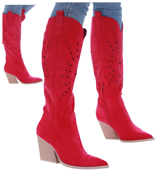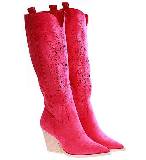Designerskie damskie kozaki kowbojki na szerokim słupku w kolorze fuksji to odważny wybór dla kobiet, które cenią sobie styl i charakter. Wykonane z zamszowego materiału, te buty wyróżniają się intensywną barwą, która ożywi każdą stylizację. Ażurowa cholewka zapewnia przewiewność i komfort noszenia, nawet przez dłuższy czas.