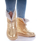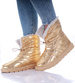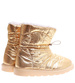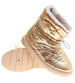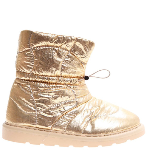 • Kozaki śniegowce damskie wykonane z materiału tekstylnego w złotym kolorze.