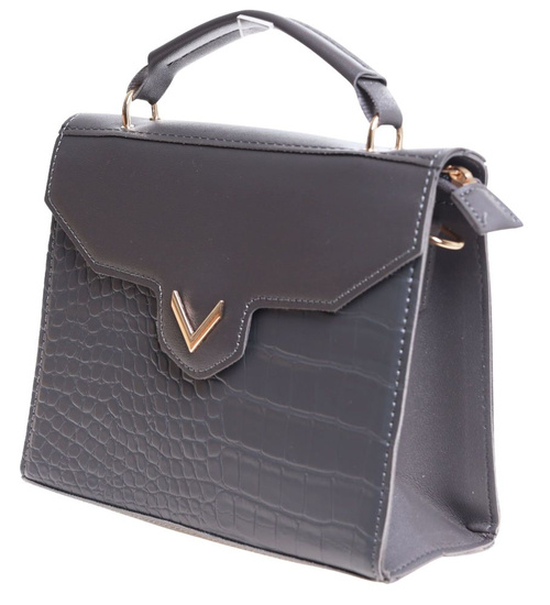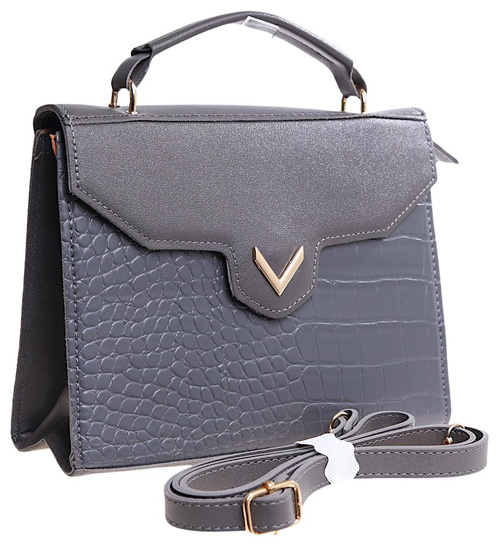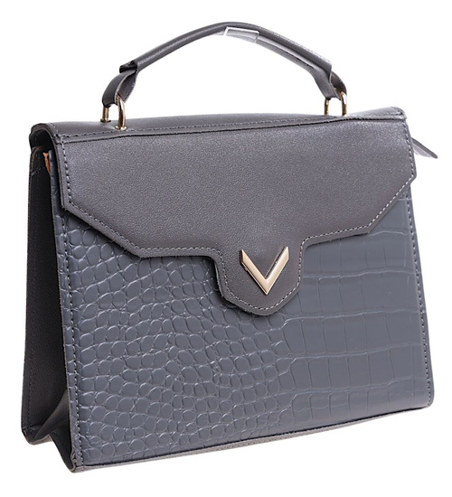 - Modna damska torebka w kolorze szarym wykonana z materiału skóropodobnego.