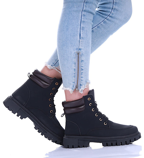 - Czarne sznurowane trapery z ociepleniem wykonane z materiału skóropodobnego o fakturze nubuku.