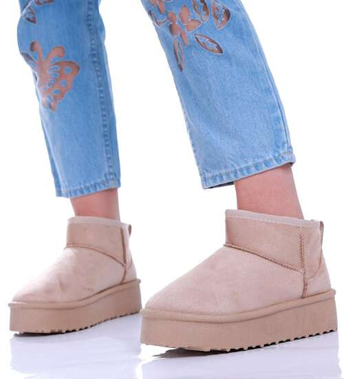 - Kozaki śniegowce damskie wykonane z zamszu w kolorze beżowym.