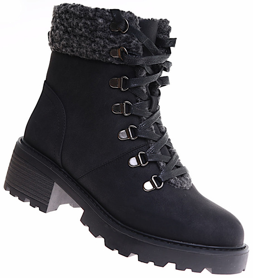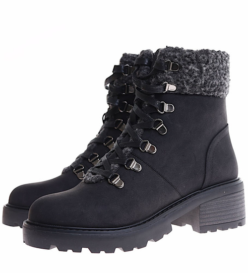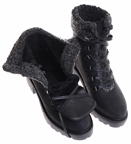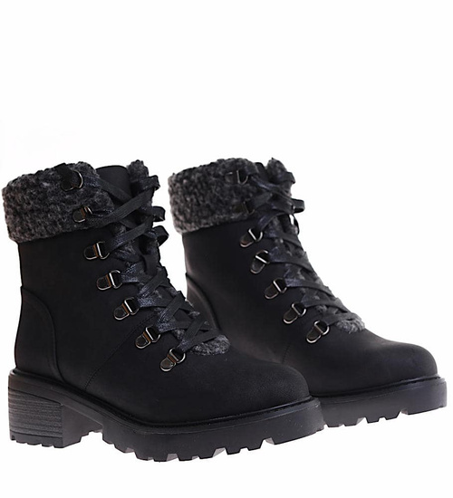 - Czarne sznurowane botki trapery ocieplane kocem obuwniczym.