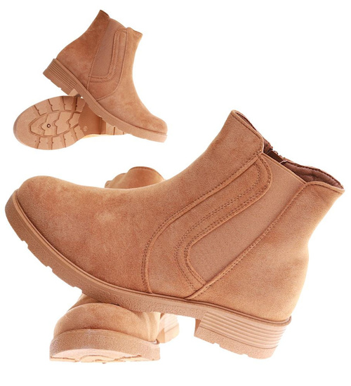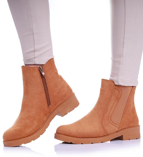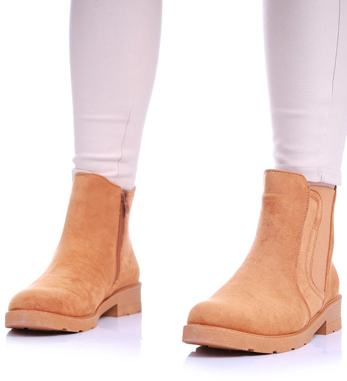 - Casualowe botki damskie wykonane z materiału zamszopodobnego w kolorze camel.