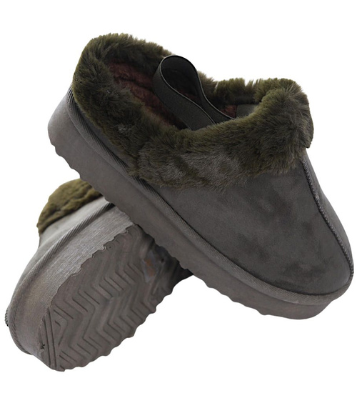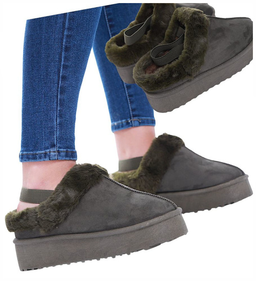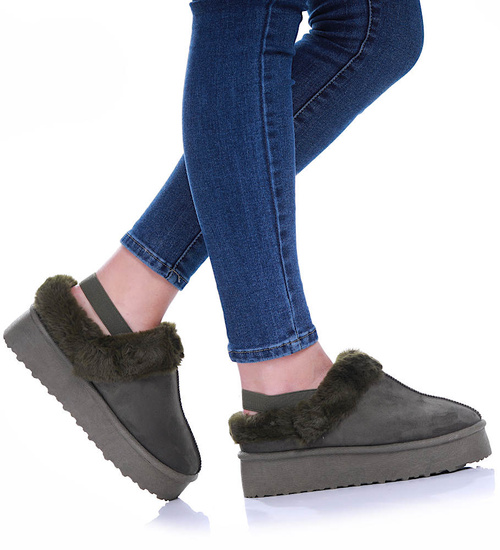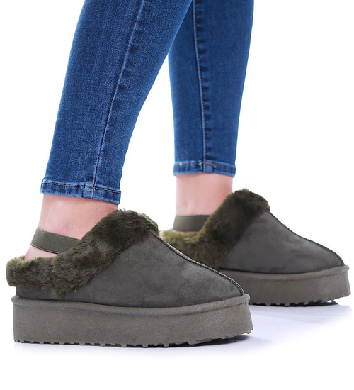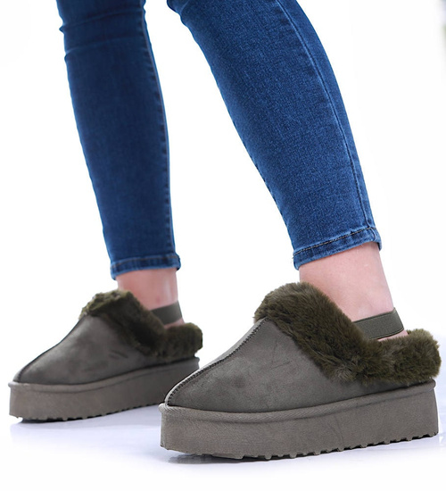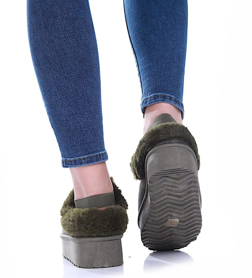 • Oliwkowe niskie śniegowce damskie z grubym futerkiem.