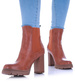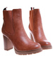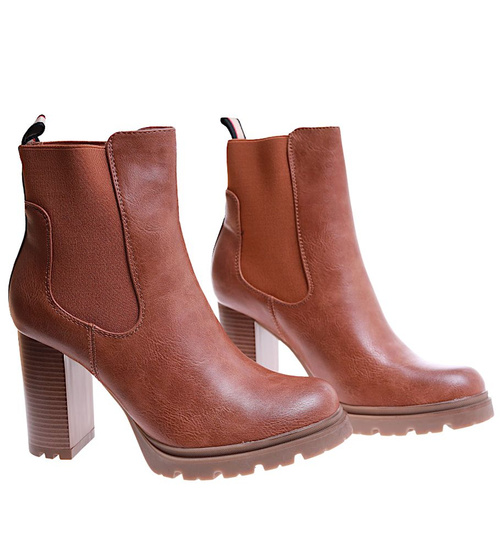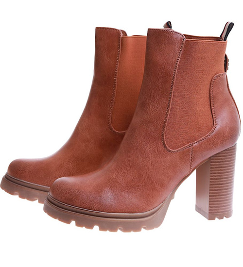 - ✅ Wygodne damskie botki wykonane z materiału skóropodobnego w brązowym kolorze.