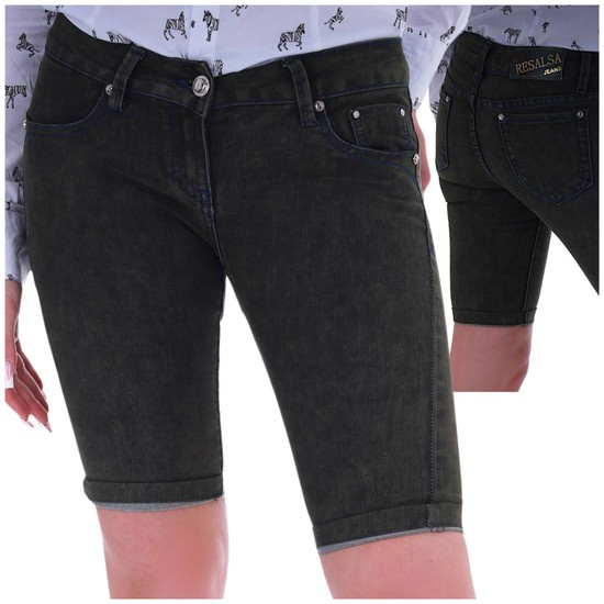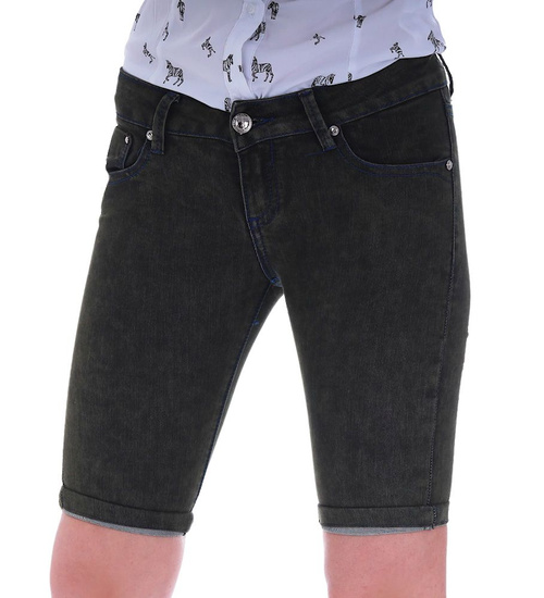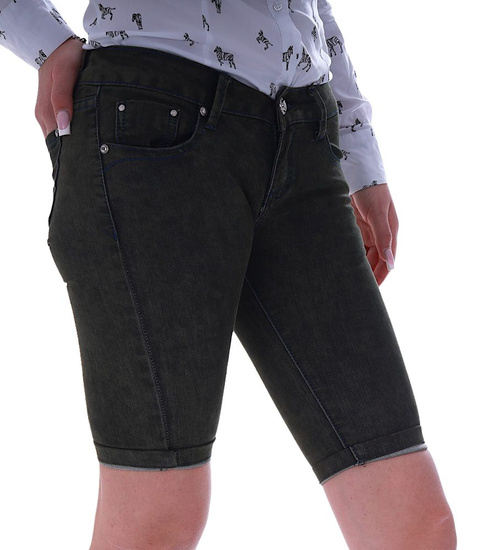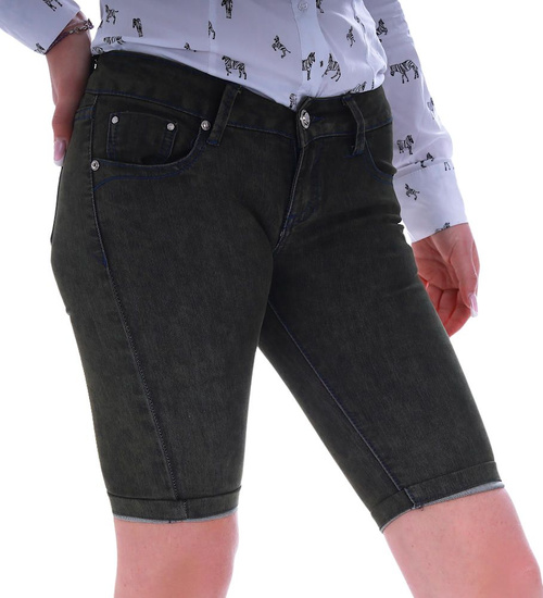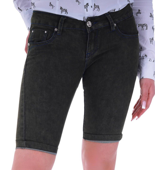 - Krótkie jeansy damskie w ciemno zielonym kolorze, wykonane z elastycznego materiału.
