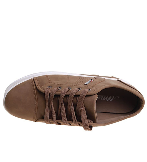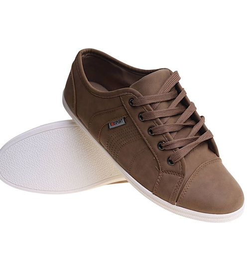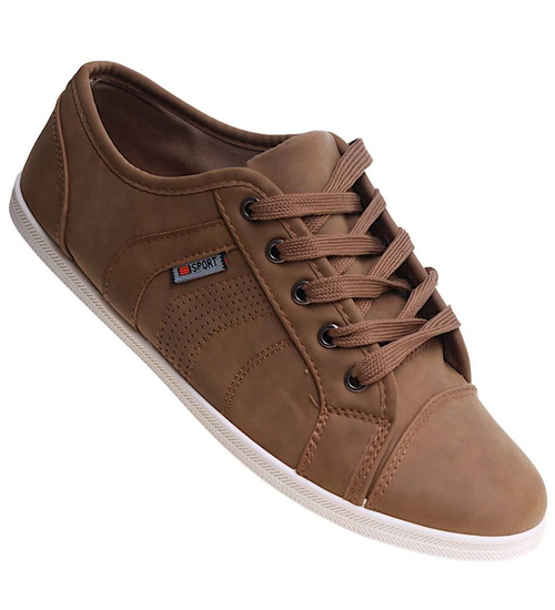 - Sznurowane męskie trampki wykonane z miękkiego materiału skóropodobnego.
