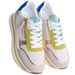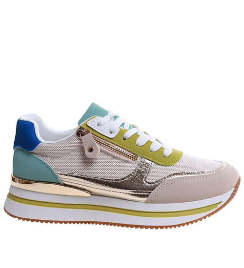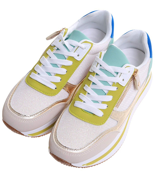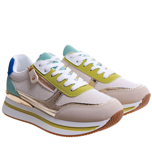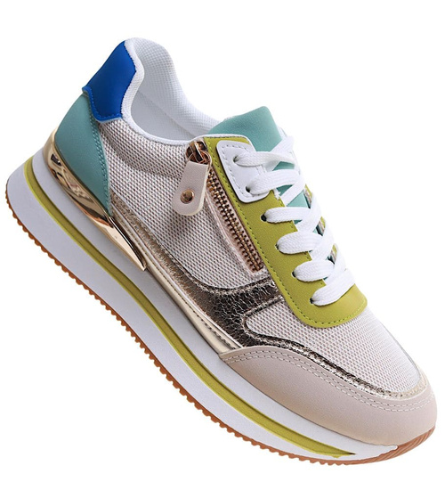 Te damskie sportowe buty to idealne połączenie modnego designu i codziennego komfortu. Wykonane w efektownej kolorystyce beżu, zieleni i złota, świetnie wpisują się w wiosenne trendy. Dzięki elastycznej platformie zapewniają wygodę i amortyzację na każdym kroku.