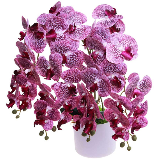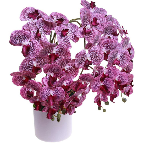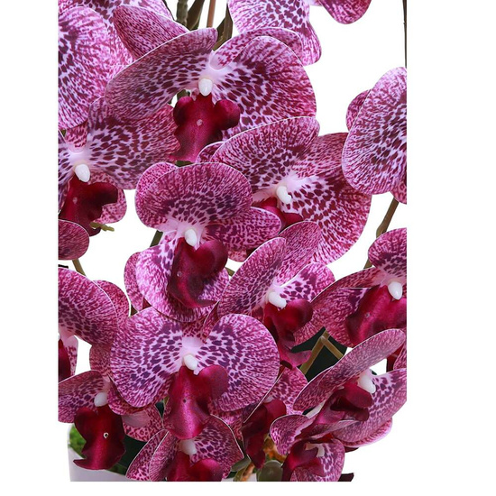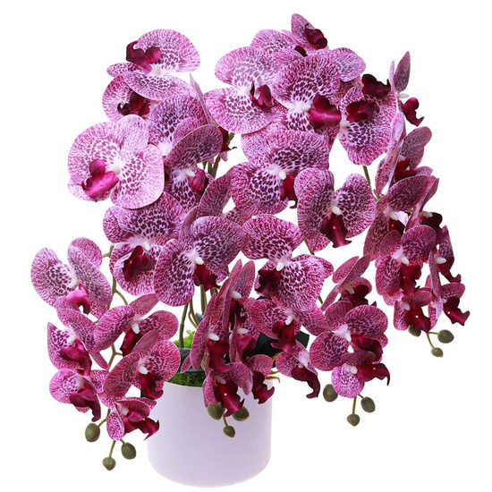 Dodaj niepowtarzalny akcent do swojego wnętrza dzięki ręcznie wykonanemu w Polsce sztucznemu storczykowi o wysokości 60 cm. Ten imponujący model z pięcioma pędami i aż 60 realistycznymi kwiatami w odcieniach głębokiego fioletu zachwyca swoją elegancją i niezwykle naturalnym wyglądem, doskonale odwzorowując piękno żywych roślin.