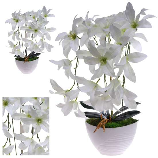 Dodaj wyjątkowy akcent do swojego domu lub biura dzięki sztucznemu storczykowi Cymbidium w kolorze białym. Ten efektowny, trzypędowy model o wysokości 50 cm zachwyca dużą ilością delikatnych, realistycznie wykonanych kwiatów w odcieniach czystej bieli oraz subtelnymi zielonymi dodatkami, które podkreślają jego naturalny wygląd.