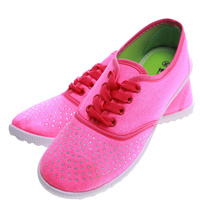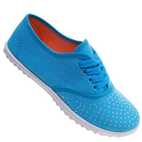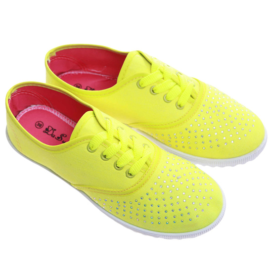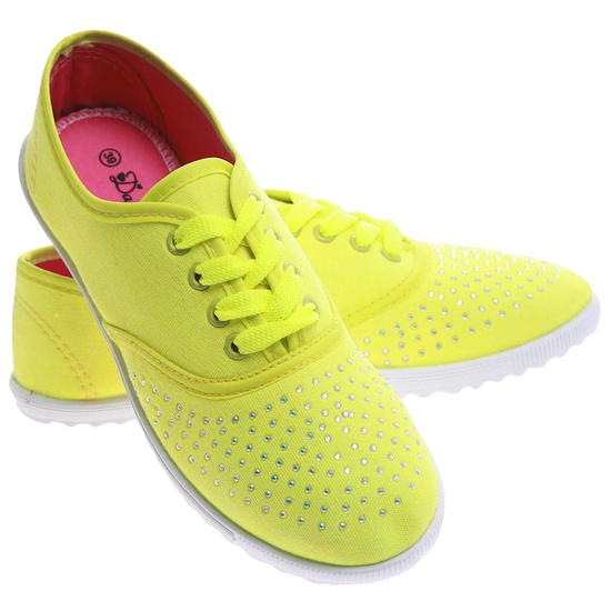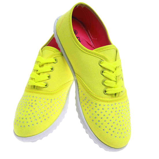 - Żółte tenisówki damskie wykonane z miękkiej tkaniny.