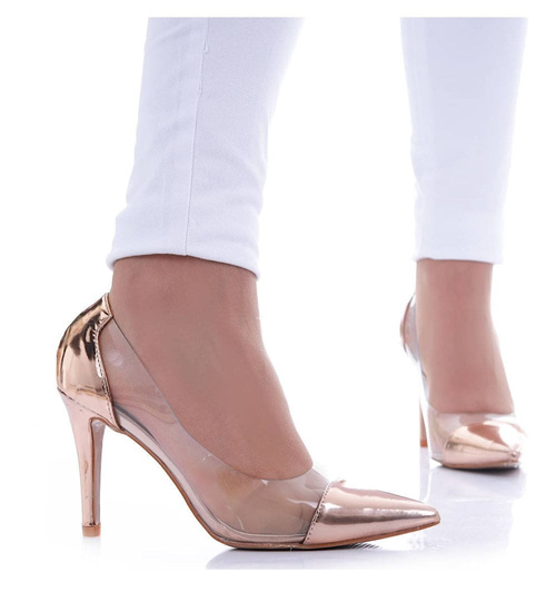 Szampańskie szpilki damskie z transparentnymi wstawkami – eleganckie buty do wizytowych topów