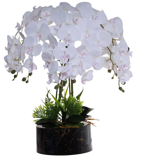 Całość dopełnia efektowna czarna donica ze złotymi prążkami imitującymi marmur, wykonana z trwałego plastiku. Produkt jest całkowicie bezobsługowy – zawsze wygląda świeżo i efektownie, nie wymagając żadnej pielęgnacji.