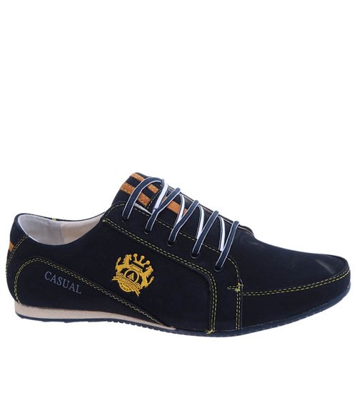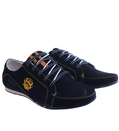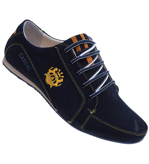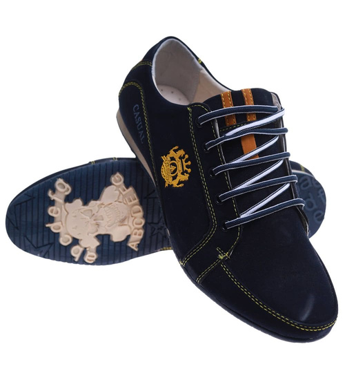 - Na wierzchu butów zwraca uwagę połączenie granatowego koloru ze żółtymi akcentami, które nadają modelowi niebanalnego charakteru. Żółte przeszycia podkreślają kształt i dodają całości nowoczesnego wykończenia. Dzięki klasycznemu sznurowaniu, buty można idealnie dopasować do stopy, co wpływa na komfort noszenia oraz umożliwia indywidualne ustawienie napięcia sznurowadeł.