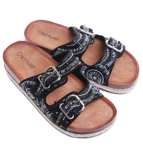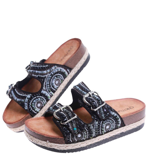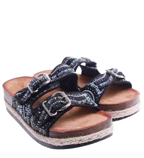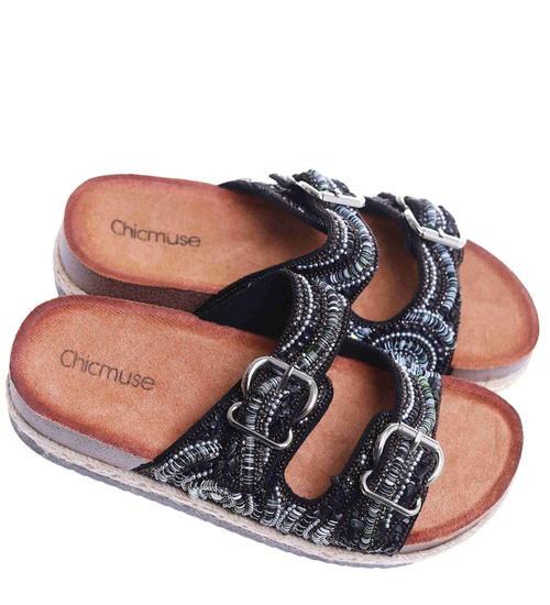 Czarne klapki damskie z szarym połyskiem – styl i wygoda na lato