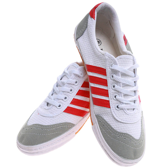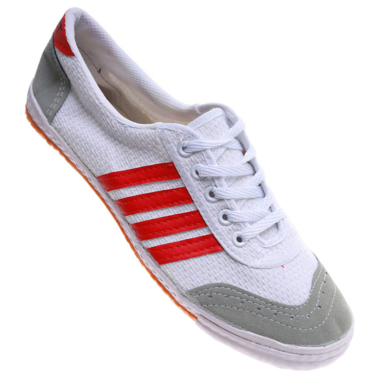 - Te białe trampki halowe z czerwonymi paskami to praktyczne i stylowe obuwie dla młodych chłopców ceniących wygodę i sportowy wygląd.