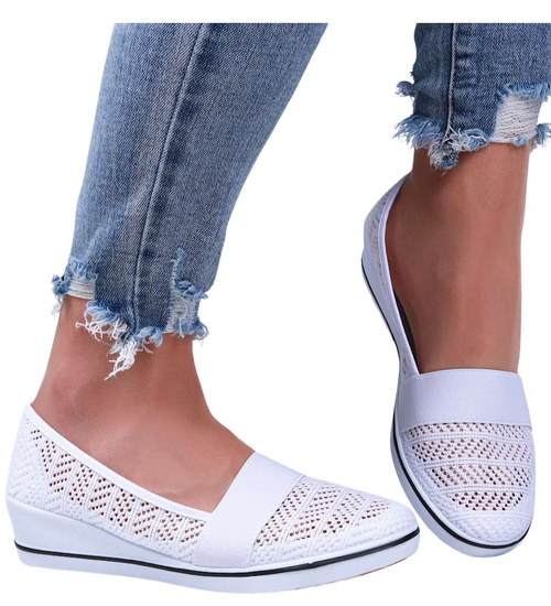 • Białe tenisówki damskie na niskim koturnie to lekka i uniwersalna propozycja do codziennych stylizacji.